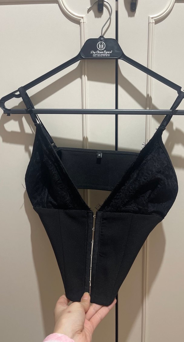 Siyah süet malzemeden, V yakalı, askılı ve tokalı gotik tarzda, vücuda oturan bir büstiyerdir. Romantik gece için uygundur.
