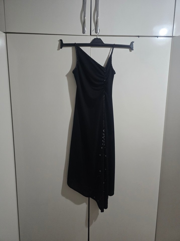 Siyah süet kumaştan, V yakalı ve askılı, drapeli uzun ve dar kesim elbise. Romantik akşamlar için uygundur.