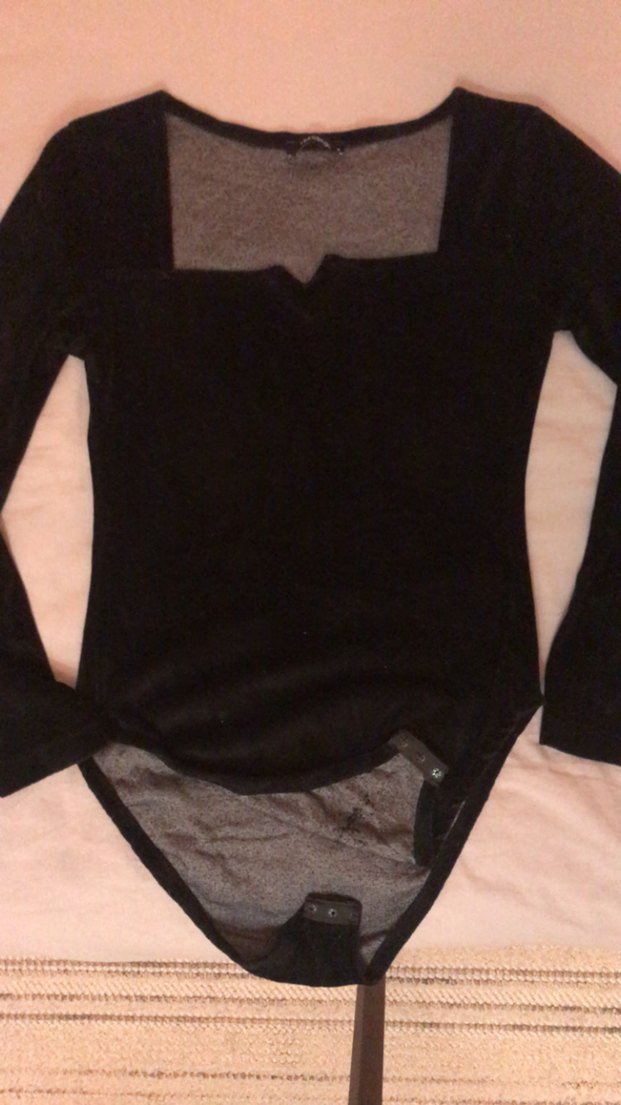 Siyah, süet kumaştan, V yakalı, uzun kollu, cesur gotik tarzda günlük body.