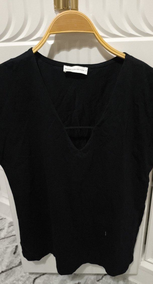 Siyah süet kumaştan, V yakalı ve kısa kollu, gövdeye oturan minimalist gotik tarzda midi boy bluz. Günlük kullanıma uygundur.