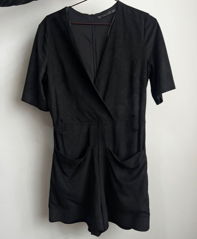Siyah süet kumaştan, V yakalı, kısa kollu ve drapeli tasarıma sahip, cepli, bol kesim kısa tulum. Ofis ve günlük kullanıma uygundur.