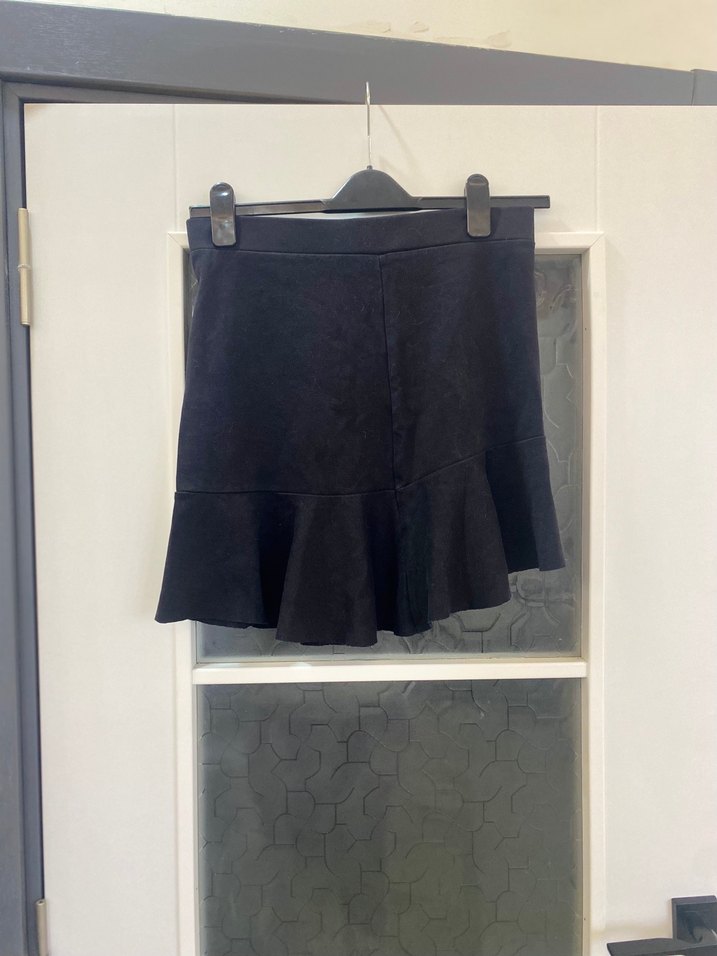 Siyah renk, süet kumaştan yapılmış, volanlı uçlu ve vücuda oturan mini etek. Gotik tarzda, günlük şıklık için uygundur.
