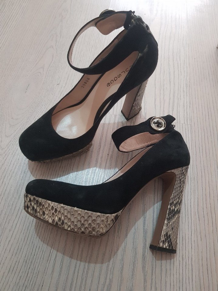 Siyah süet stiletto platform topuklu, yılan deseni detaylı. Tokalı kayışlı, romantik ve gotik tarz için uygun. Nursace. deforme yerleri fotoğraflarda mevcut.