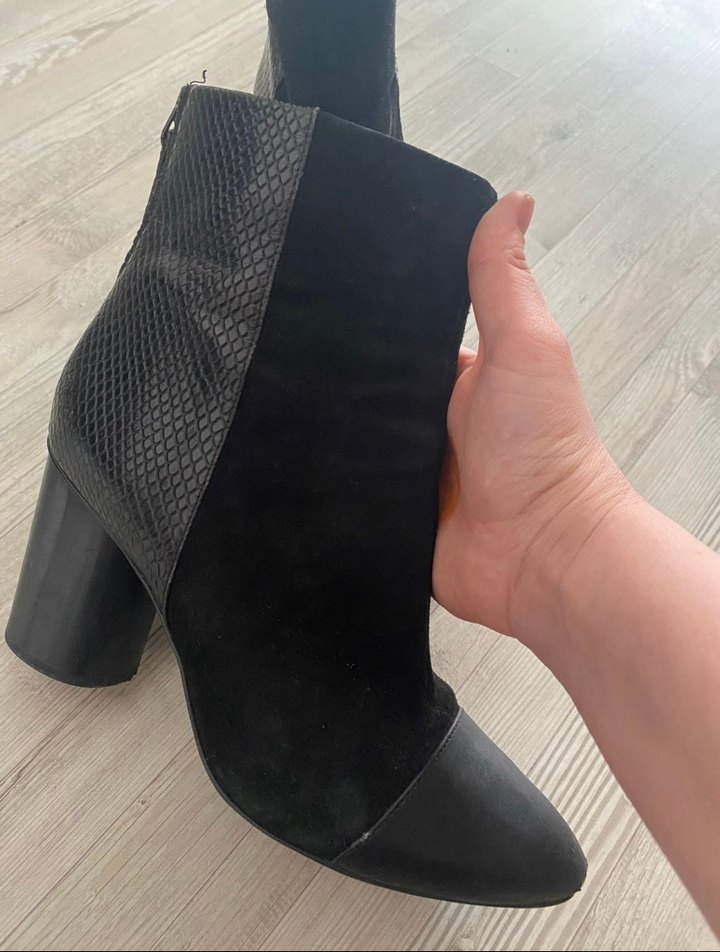 Nine West marka Siyah süet malzemeden, yılan deseni ve kürk detaylı, blok topuklu rahat ve şık kadın botu. Günlük kullanıma uygundur.