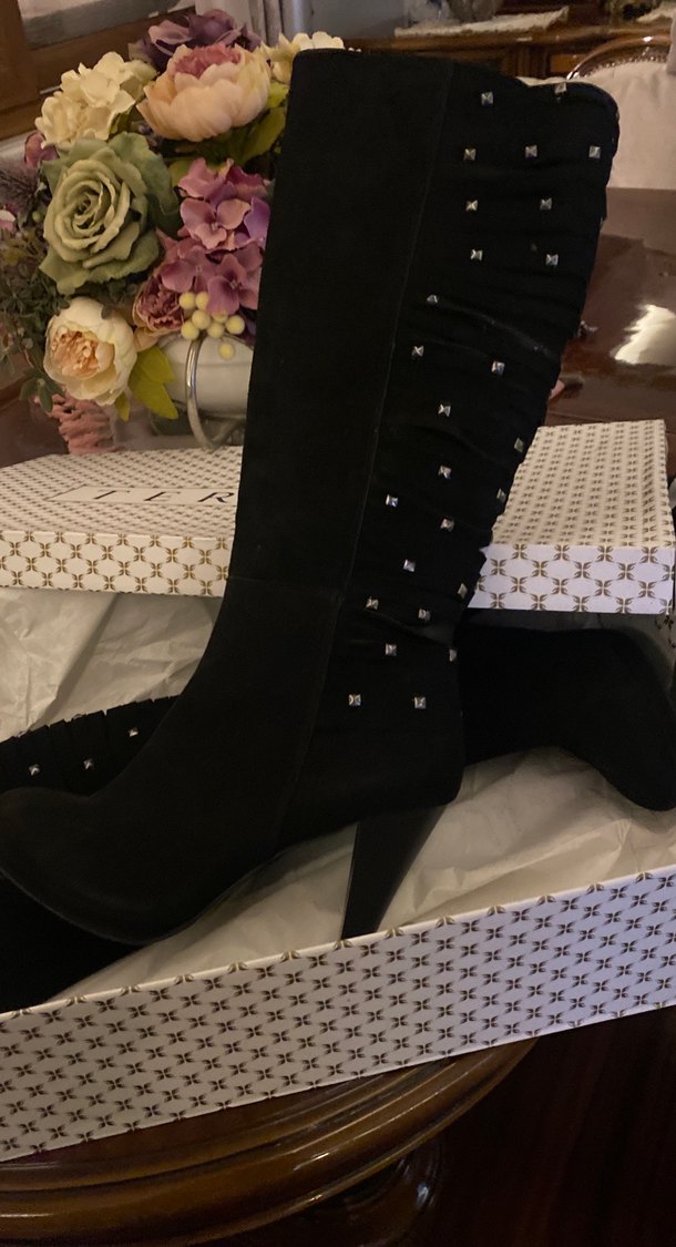 Siyah süet diz boyu çizme, yüksek topuklu, nakışlı detaylar ve tokalı kayışlara sahip, gotik şıklık için uygun.