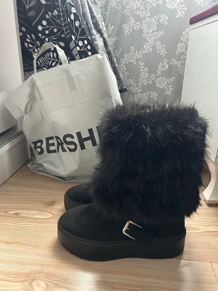 Siyah süet, yüksek topuklu, kürklü ve tokalı bot. günlük kullanım için uygundur. Marka: bershka