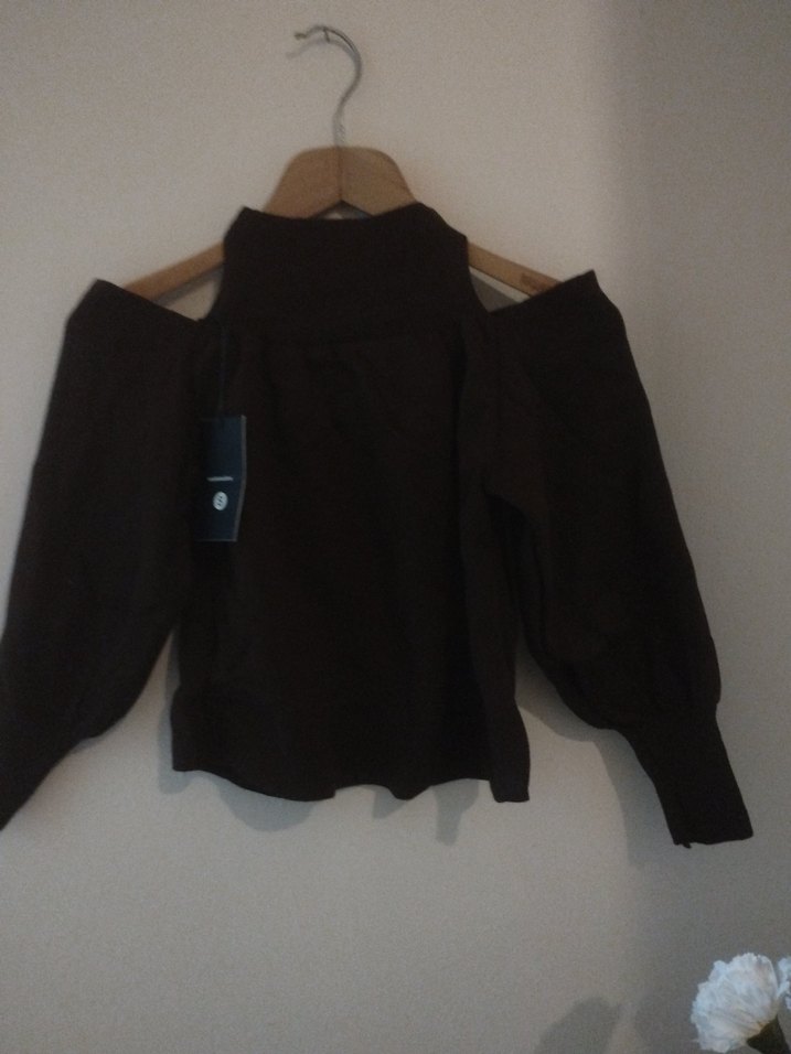 Siyah süet kumaştan, yüksek yakalı ve uzun kollu, omuzları açık tasarıma sahip bol kesim kadın bluz. Bel detaylıdır, günlük şıklık için uygundur.