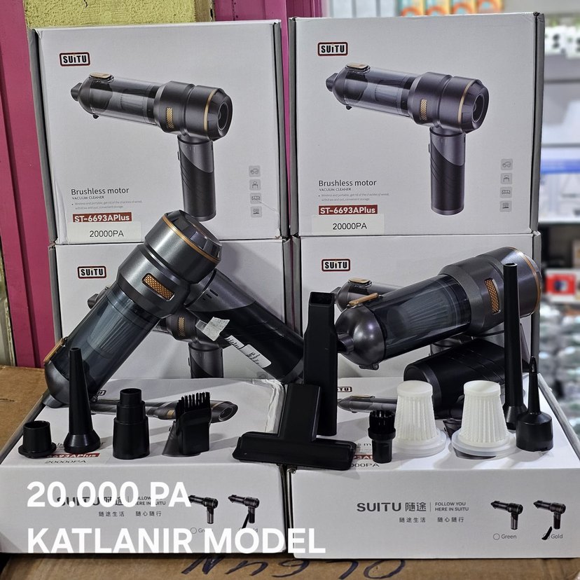 SUITU kablosuz elektrikli süpürge, 20000PA çekiş gücüne ve fırçasız motora sahiptir. Siyah renkte, çeşitli başlıklarla birlikte gelir.