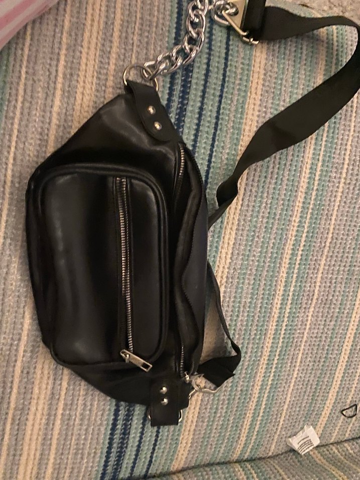 Siyah suni deri çapraz çanta, kilitli detaylar ve fermuarlı cepler ile grunge punk tarzını yansıtıyor.