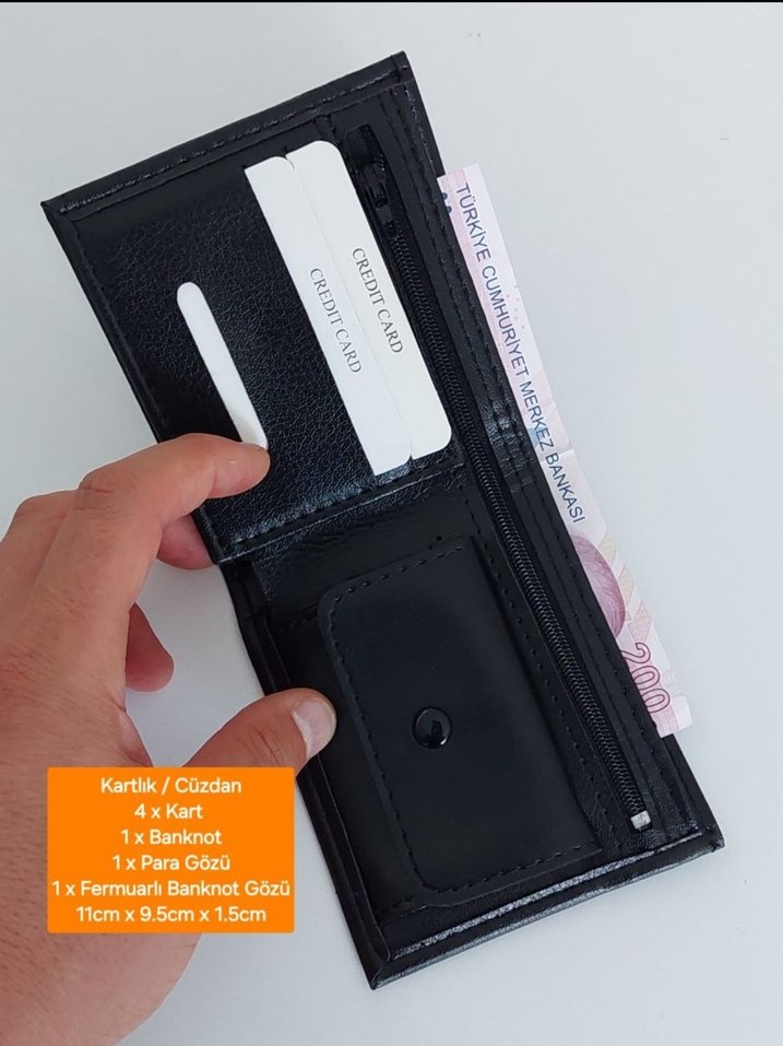 Siyah suni deri cüzdan, 4 kartlık, 1 banknot bölmesi, fermuarlı para gözü ve para cebi içerir. Ölçüleri 11x9.5x1.5 cm.
