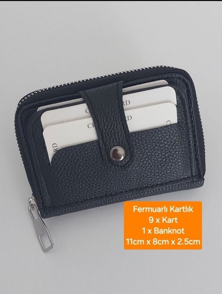 Siyah suni deri fermuarlı erkek cüzdan, 9 kartlık ve 1 banknot bölmeli. Ölçüleri 11x8x2.5 cm.