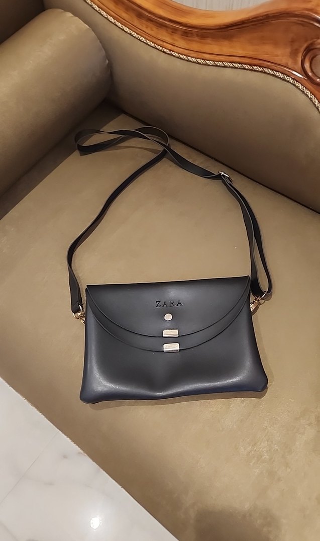 Zara markalı, tokalı kapaklı siyah suni deri kadın çantası. Minimalist tasarımıyla günlük sokak stili için uygundur.Clutch olarak da kullanılabilir.Öndeki metal kısımlarda hafif soyulma,renk değişikliği var.
