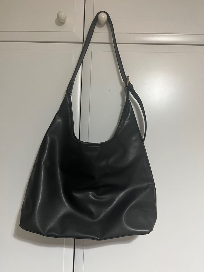 Siyah suni deri kadın omuz çantası, salaş model, sade ve desen içermeyen minimalist tasarıma sahiptir. Günlük kullanım için uygundur ve rahat şıklık sunar.