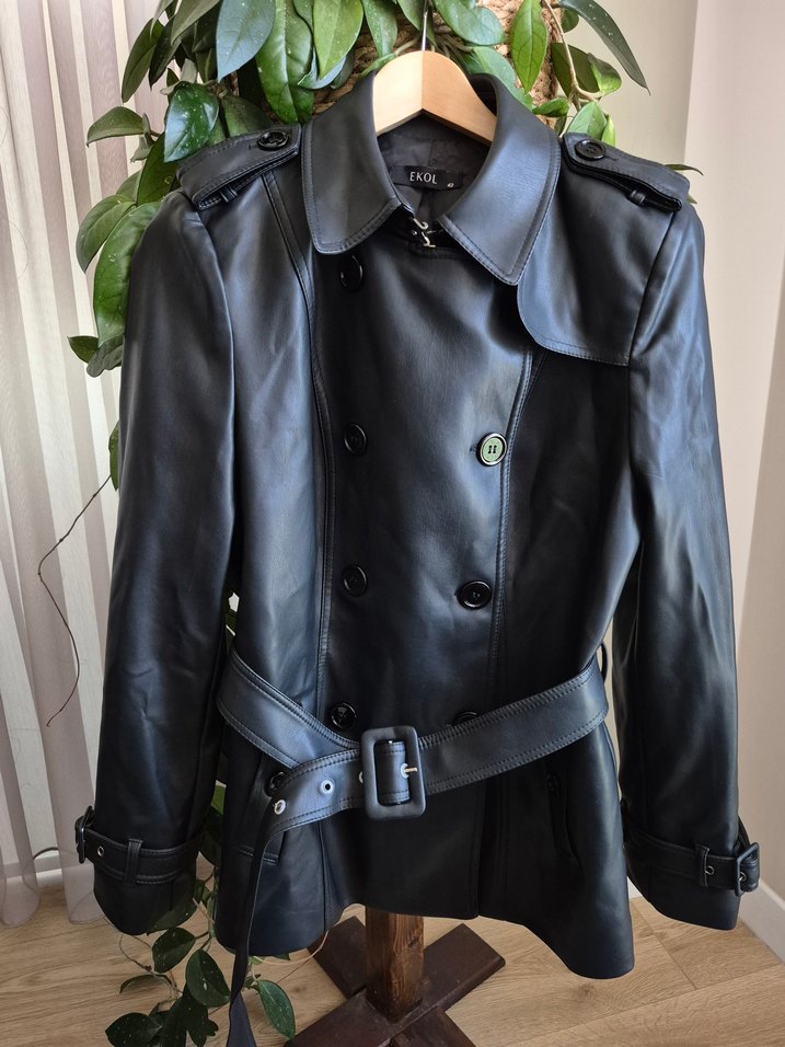 Siyah deri, kemerli ve çıtçıtlı detaylara sahip midi uzunlukta ceket. Regular fit ve askılı kollu, günlük kullanıma uygun goth stilinde.