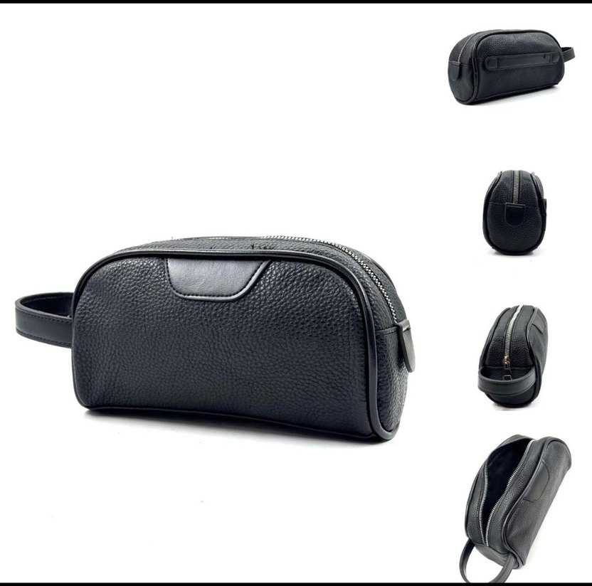Siyah suni deri elden tutmalı makyaj ve traş çantası, minimal tasarımlı ve fermuarlı kapaklıdır. Günlük kullanıma uygun modern klasik ve desensiz bir görünüme sahiptir.