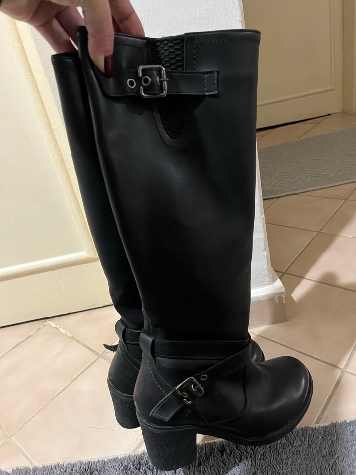 Siyah deri, tokalı , içi şardonlu çizme gündelik kullanım için sade gotik stile sahiptir.