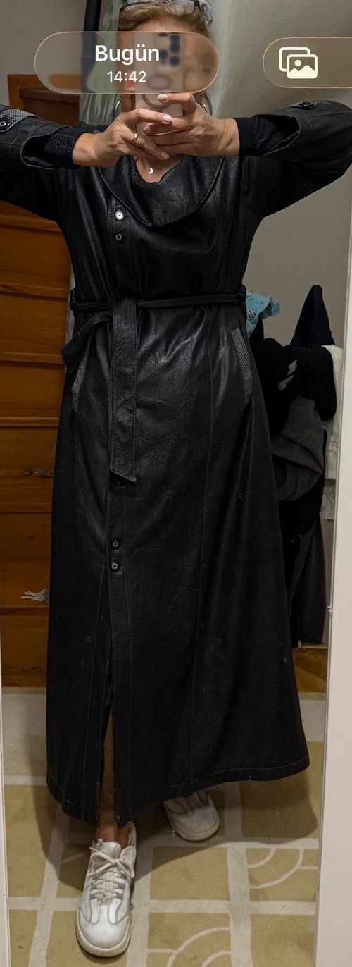 Ürün oldukça uzun,yan düğme detaylı,yuvarlak Paris yaka ,Yumuşacık,içi astarlı suni deri,siyah hafif kırışık görünümlü suni deri ama kaliteli deri görünümlü bir deri pardesü. Yaka,kol manşeti ve cep ağızlarında pitikare kumaş detayı ayrı bir şıklık veriyor. Siyah çizme,stilettolar ayakkabı veya bot ile oldukça sık ve rahattır. Düğmeleri yandan bir model. İhtiyaç fazlalığından satışta, Uzun boylu endamlı bir kişide harika durur.Bu fiyata düğmelerini alamazsınız kaçırmayın!…