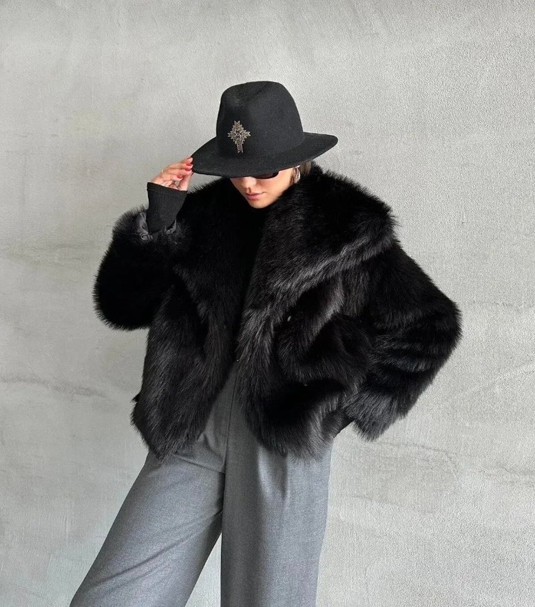 Bu siyah midi mont, uzun kolludur. Yumuşak suni kumaştan yapılmış, kürk detaylarıyla rahat ve gotik bir tarz sunar.