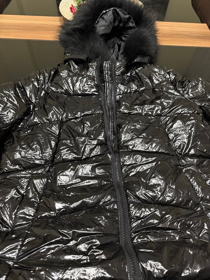 Bu siyah, parlak suni kumaştan yapılmış, kapüşonunda kürk detaylı, dar kesim kadın kışlık cekettir. Notlu yaka ve askılı kollara sahiptir. Midi boy ve desensizdir, rahat ve trend bir sokak stili sunar. ❄️
