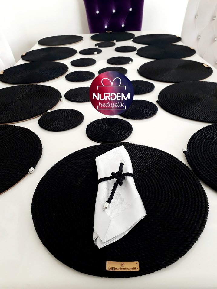12 kişilik Bohem tarzda siyah Amerikan servis seti. 12 supla +12 bardak altlığı setidir. 12 li peçete yüzükleri ise hediyedir. İstenilen renklerde hazırlanır. 30 cm ölçüsünde ahşap üzerine hazırlanır.