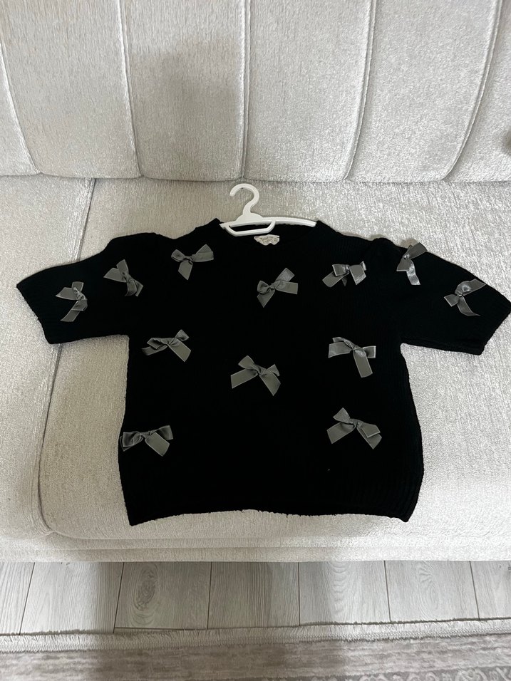Yarım kollu, siyah kadın kazak, İnce kurdele detaylarıyla sade tasarımı tamamlar. 13- 14 yaşa uygundur  ön tarafında gri kurdeleler bulunur arka tarafı ise düzdür kışlık kullanıma uygundur birkaç kere giydim kullanmadığım için satıyorum iyi durumda