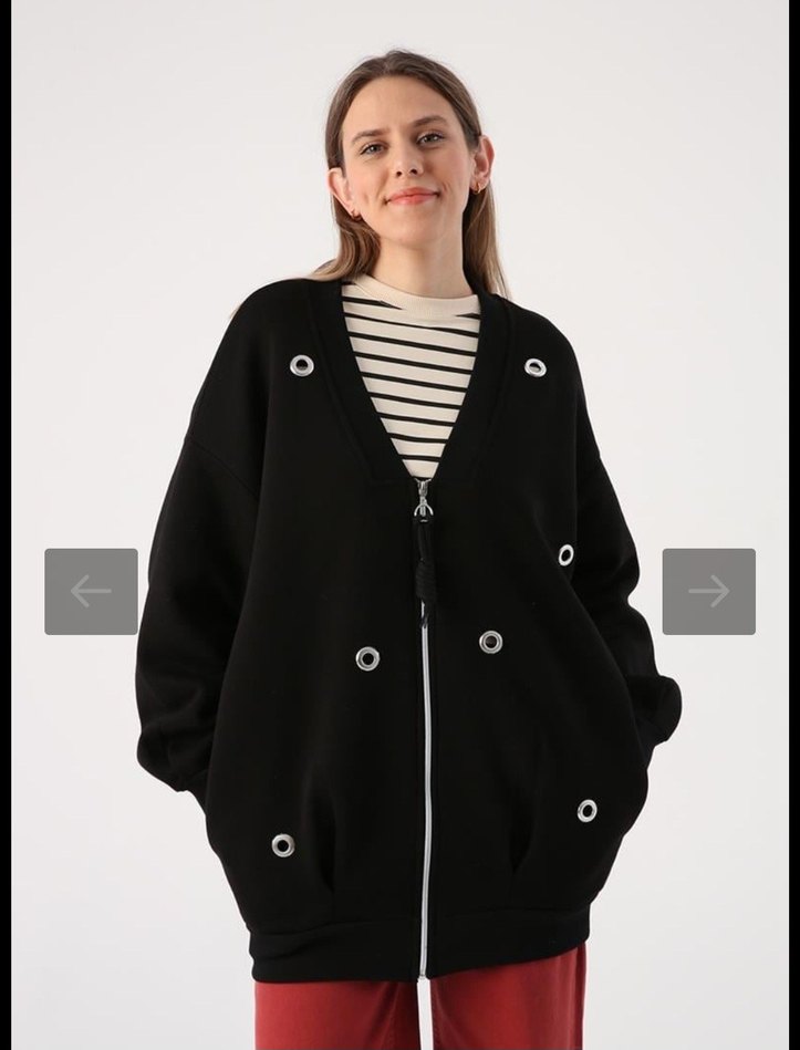 Bol kesim, uzun kollu ve siyah kadın ceket. fermuarli ve metal detayları bulunur. Yumuşak ve sıcak kumaştan, günlük kullanım için uygundur.