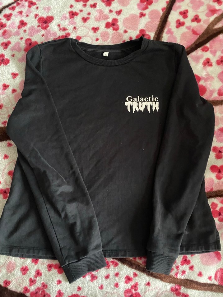 Siyah, uzun kollu, bol kesim ve bisiklet yaka kadın sweatshirt. "Galactic Truth" baskılı sentetik kumaştan, günlük kullanım için uygundur. Kadın ve erkek için uygundur.