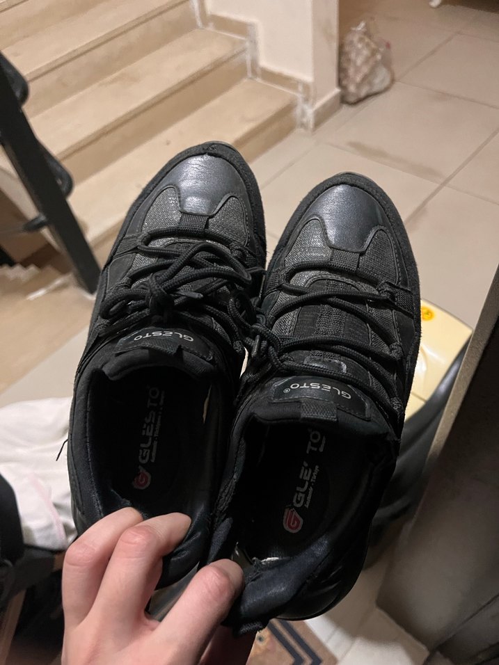 Siyah renkte, tabanlı kadın spor ayakkabısı. bağcık detaylarıyla rahat kullanım sağlar. Günlük ve sokak stiline uygun.39 no gluesta marka