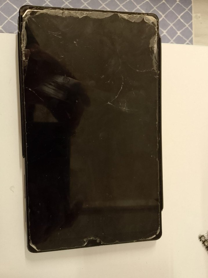 Çoklu çatlaklar ve kenarlarda aşınma bulunan siyah tablet. Cihaz kullanılmış ve yıpranmış durumda. Şarz yeri arızalı