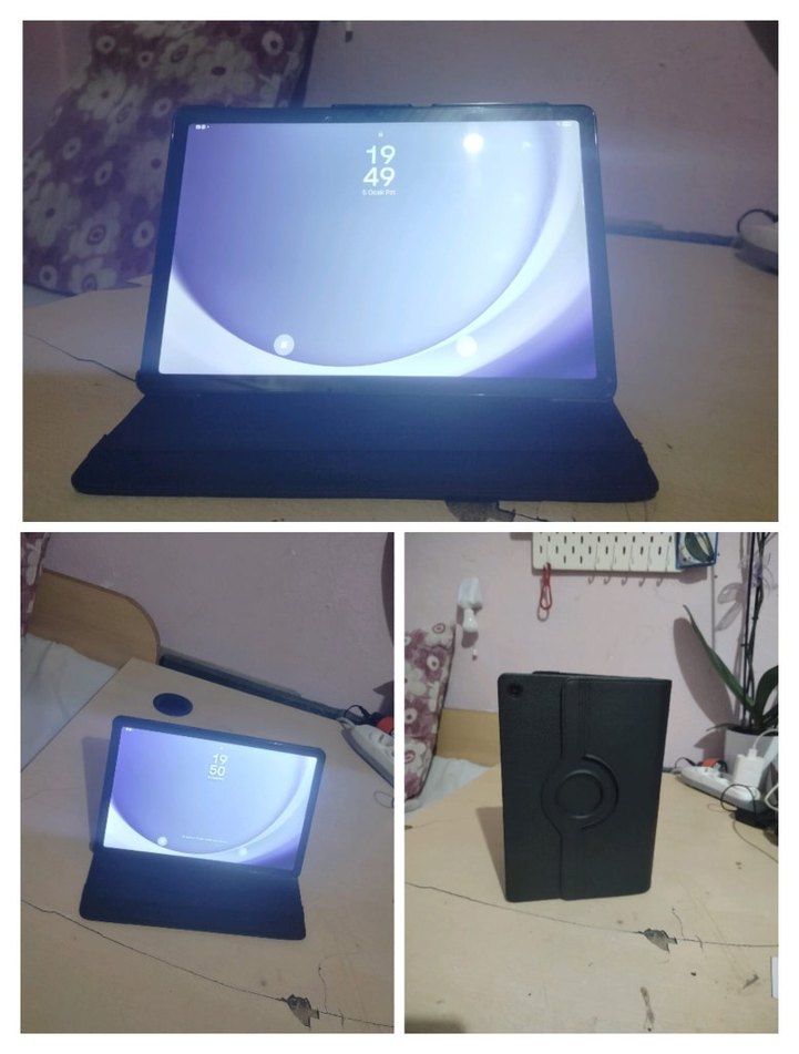 Siyah tablet, koruyucu kılıf ile birlikte. Cihaz açık ve ekranında temiz bir arayüz görülüyor. Kılıf, arka ve yanları kaplayarak koruma sağlıyor. yeni alındı hiç kullanilmadi kılıf ile birlikte gönderilecek