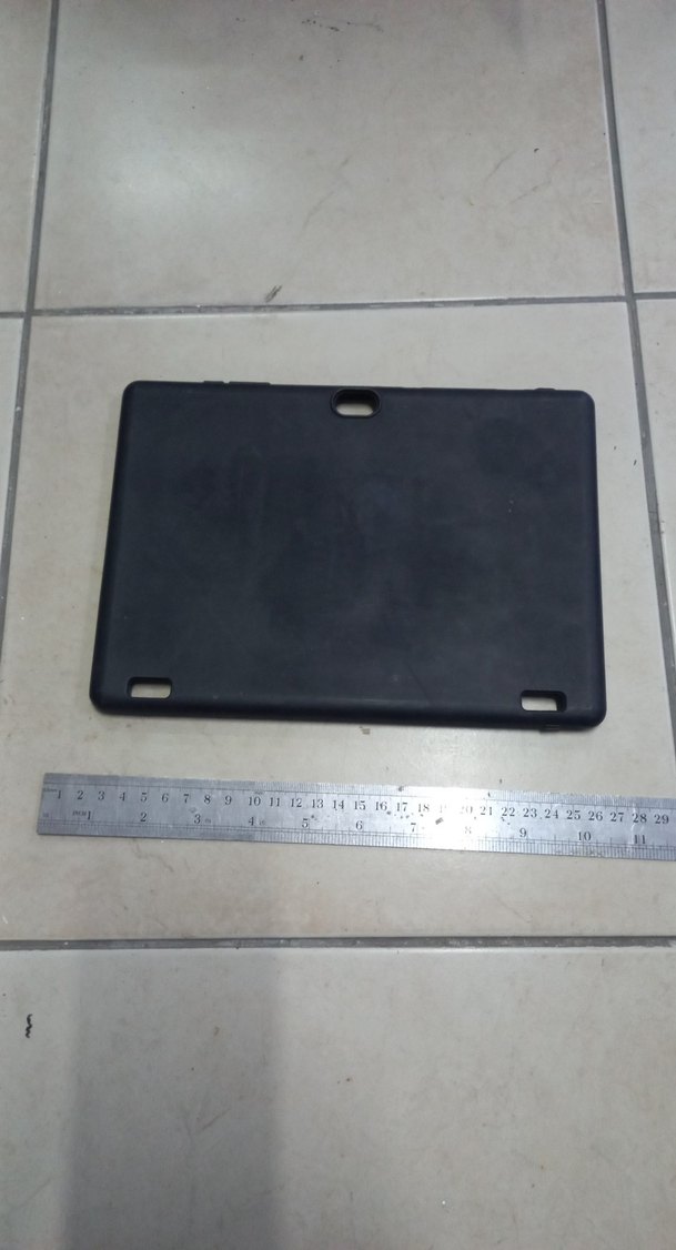Tablet için düğme ve bağlantı noktaları için kesikleri olan siyah koruyucu kılıf.