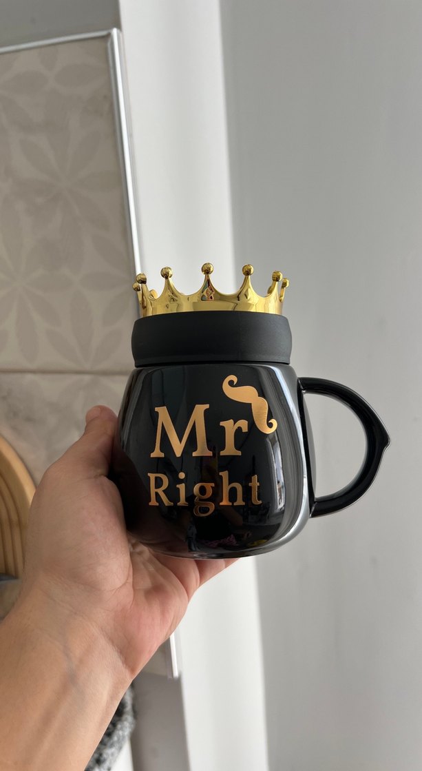 Siyah renkli, altın taç şeklinde kapaklı ve 'Mr Right' yazılı kupa. Parlak yüzeyli ve kullanışlı kulplu. ☕ göründüğü gibi temiz sorunsuz