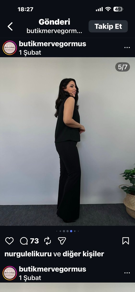 Siyah, V yakalı ve kolsuz yelekli pantolon takım, ipeksi dokusuyla rahat bir his sunar. Normal kesim ve midi boyuyla ofis için şık ve rahat bir seçenektir.