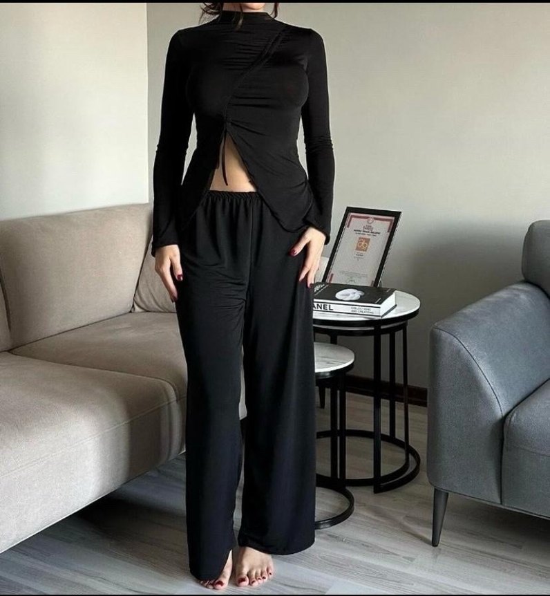 Siyah, dökümlü, uzun pantolon,ipeksi dokuda, yüksek yakalı uzun kollu üst ile kombinlenmiştir. Cesur, avangart ofis stili için uygundur.