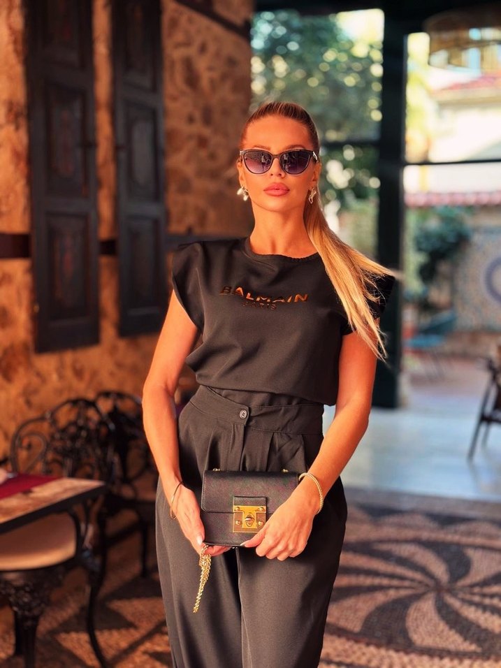 Siyah baskılı detaylı, salaş kesim, kolsuz, bisiklet yaka takım elbise. Trendy sokak stili için uygundur. Beden L
