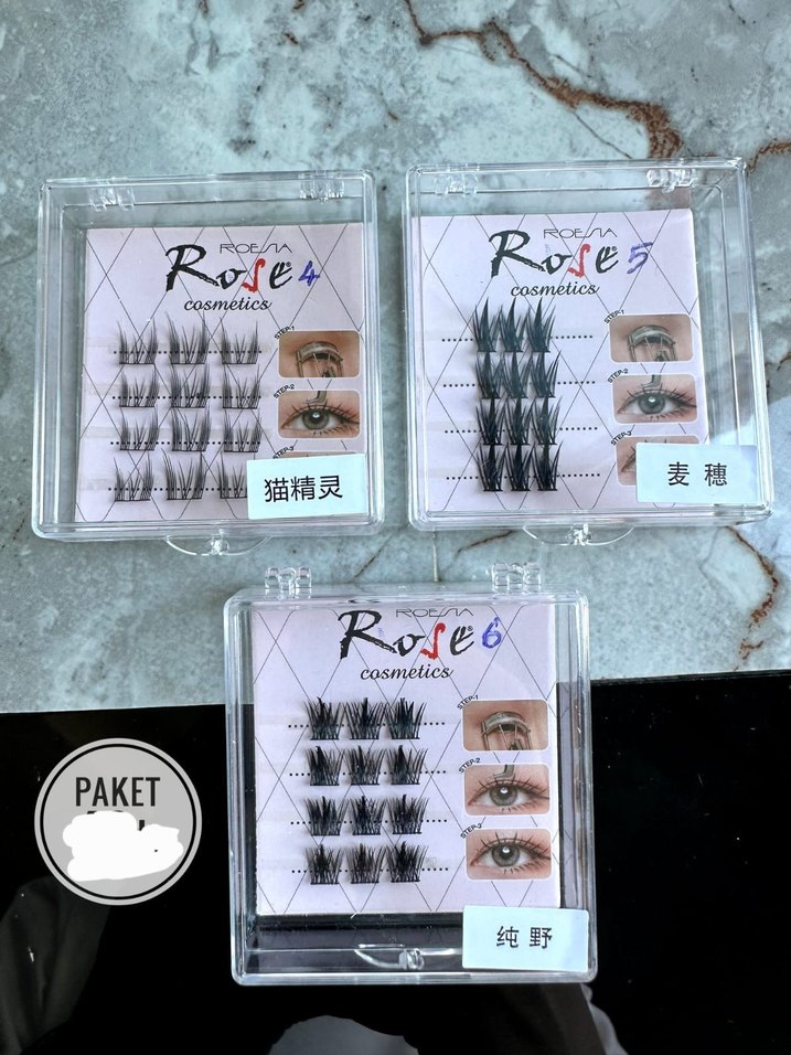 Rose Cosmetics markasına ait, farklı tarzlarda üç siyah takma kirpik paketi. Gözleri doğal şekilde belirginleştirir.