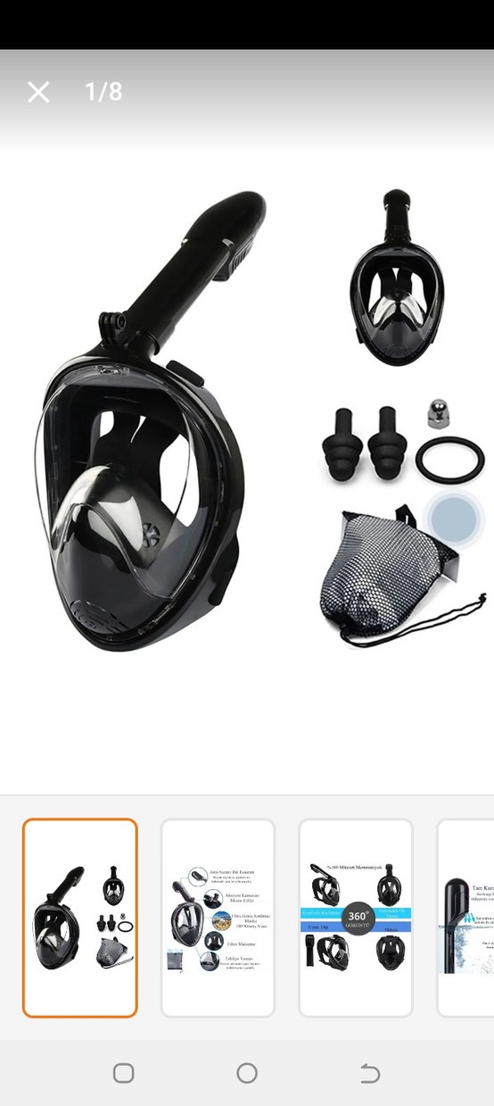 Velcro kayışlı, tam yüz siyah dalış maskesi, uyumlu tasarım ve çeşitli aksesuarlarla birlikte gelir.