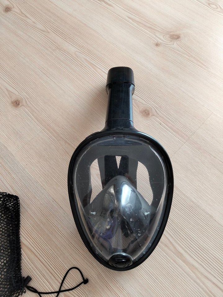 Siyah tam yüz dalış maskesi, baskılı detaylı ve fitted tasarımlı. Güvenli ayar için Velcro kayışlı. Minimalist ve biker tarzında, günlük kullanım için uygundur. ♂️