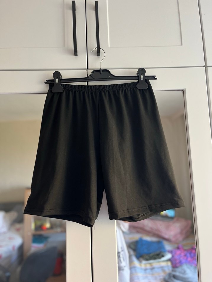 Siyah, düz renkli, sentetik kumaştan mini şortu, rahat ve bol kesim, spor ve sokak stili için uygundur.