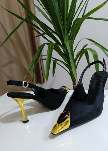 Altın detaylı sivri burun ve topuklu, stiletto. Romantik akşamlar için klasik ve çağdaş şıklık sunar.