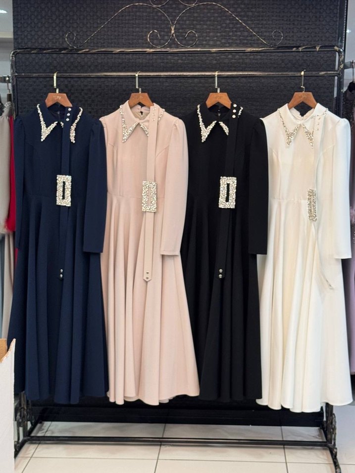 Siyah taş detaylı uzun elbise