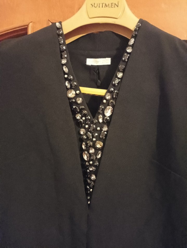 Siyah uzun yarım kollu elbise-tunik, v yaka ve uzun kolludur. Ofis için uygundur. L bedene uygundur.