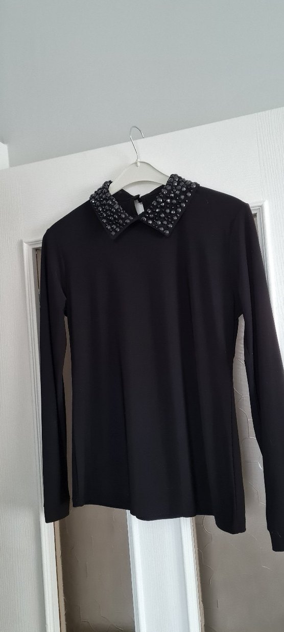 Siyah Taş İşlemeli Yaka Uzun Kollu bluz