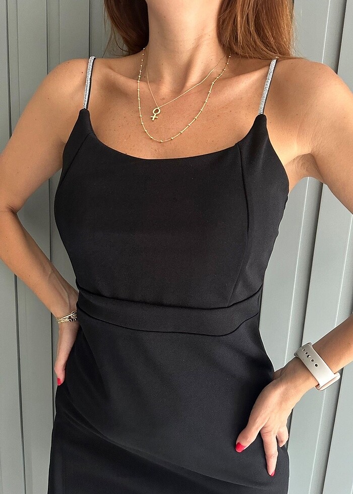 Siyah taş kristal askılı krep elbise