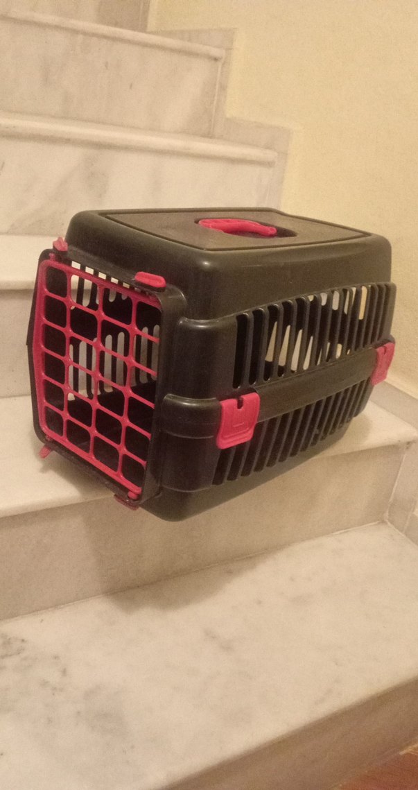 Kedi ve küçük hayvanlar için siyah taşıma kabı, havalandırma delikleri ve kırmızı kilitlerle güvenli taşıma sağlar. Üstte taşıma sapı bulunur.