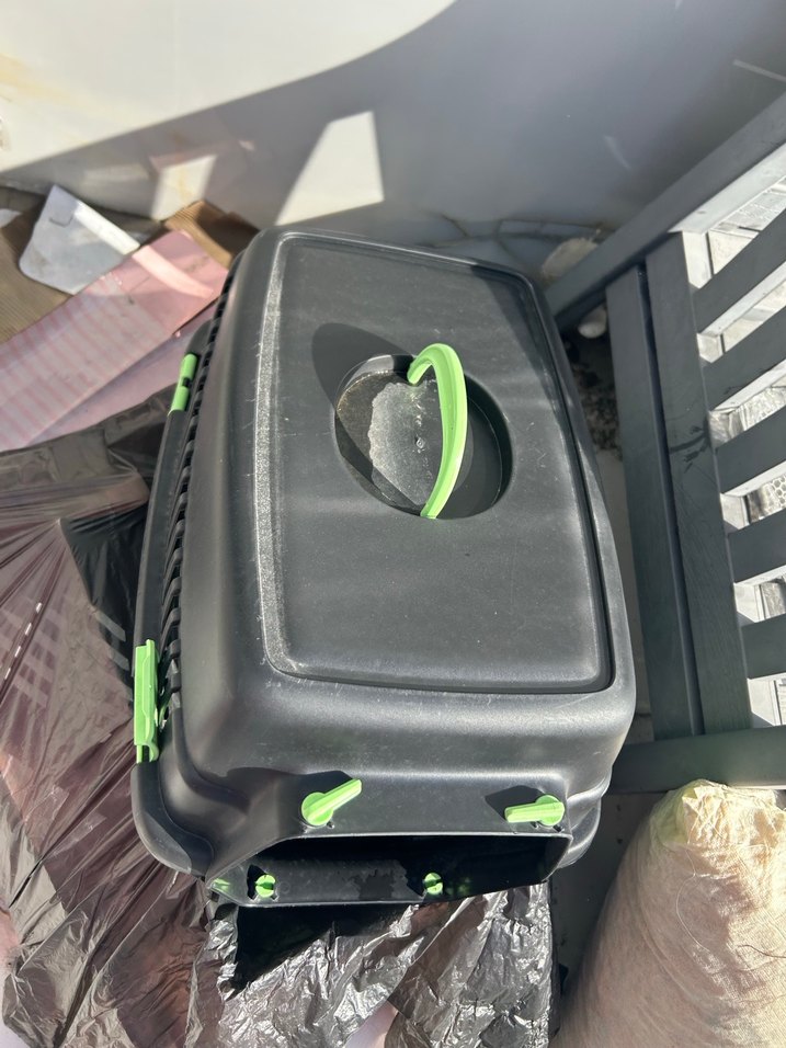 Yeşil sap ve kilitlere sahip siyah evcil hayvan taşıma kabı, kolay taşımaya ve güvenli kapanmaya uygundur. Tuvaleti, faraşı ve kum bezi mevcuttur