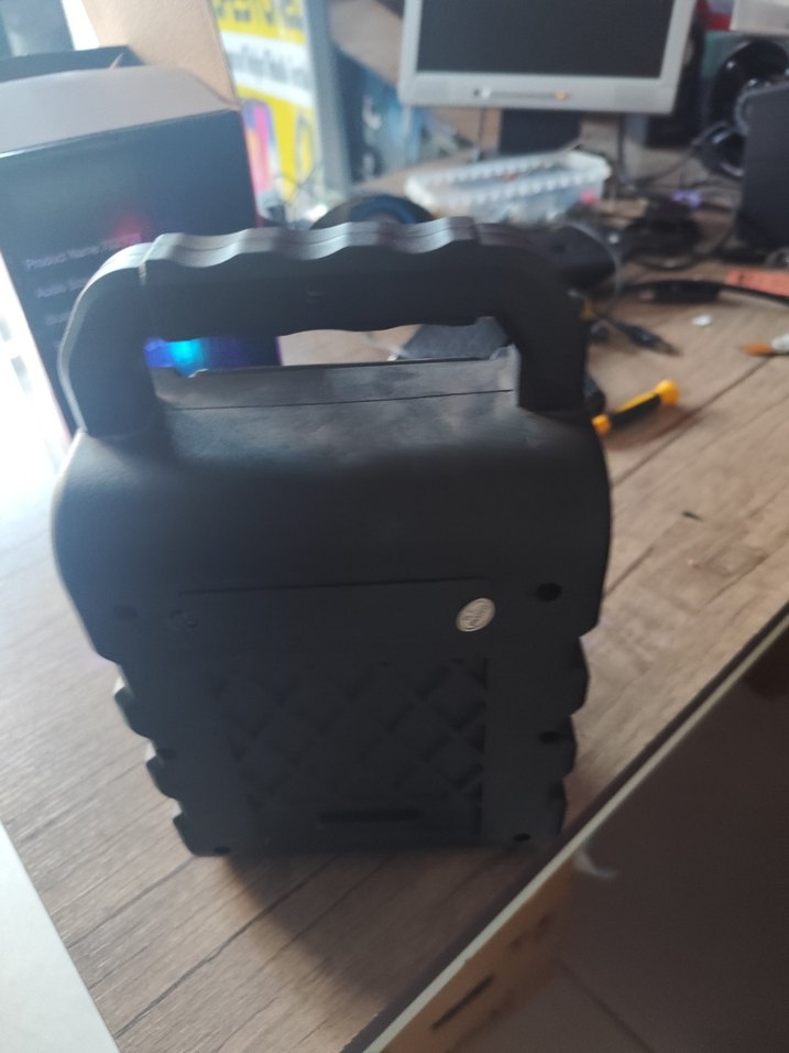Siyah taşınabilir Bluetooth hoparlör, kolay taşıma için sağlam tutma sapı ve kompakt tasarıma sahiptir. uzun süre bataryası mevcuttur.