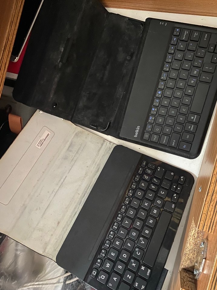 Kullanılmadığı için dış kısmında soyulmalar oldu İki siyah taşınabilir klavye, koruyucu kılıflı ve kompakt düzenli, taşınabilir kullanım için uygundur. ⌨️
