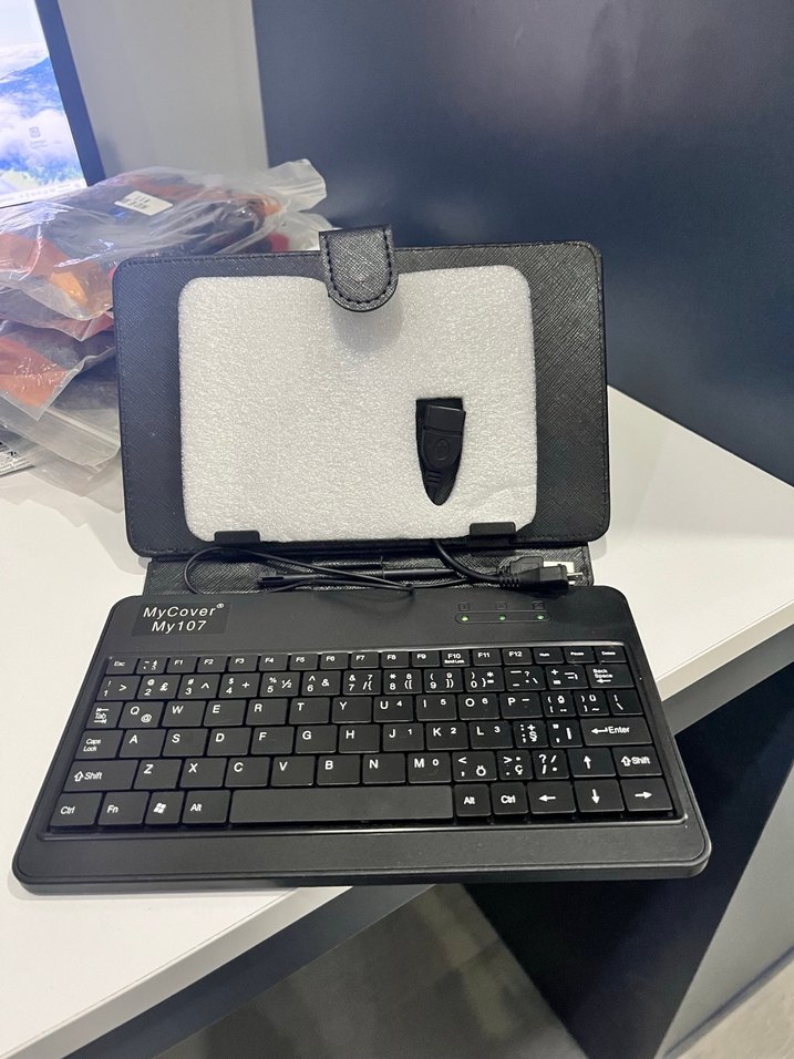 USB bağlantılı, entegre klavyeli siyah taşınabilir tablet kılıfı. Koruyucu kapak ve tablet tutucu içerir. ⌨️ 7 inch tabletlerle uyumludur. elimde 2 tane daha mevcuttur.