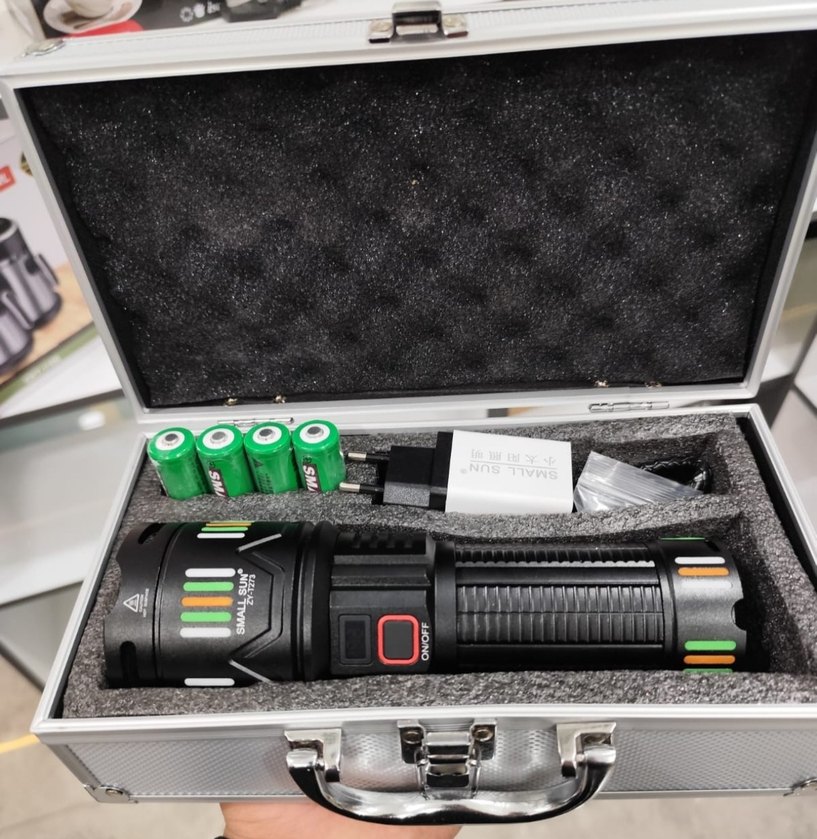 Sağlam taşıma kutusunda çoklu pil ve şarj cihazı ile siyah şarjlı el feneri seti.